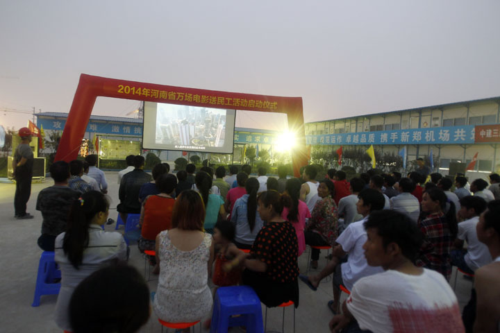 6月10日晚8時, 鄭州機場二期工程建設(shè)工地中建三局新鄭機場T2航站樓項目指揮部大院內(nèi)人聲鼎沸、歡歌陣陣,由中共河南省委宣傳部、河南省廣電局、鄭州機場二期工程建設(shè)指揮部主辦,鄭州市文化廣電新聞出版局、河南新農(nóng)村數(shù)字電影院線有限公司、鄭州商都數(shù)字電影院線有限公司、中建三局新鄭機場T2航站樓項目部承辦的2014年河南省萬場電影送民工活動啟動儀式如期舉行,300余名鄭州機場二期工程參建人員興致勃勃地觀看了河南影視制作集團(tuán)出品的《永遠(yuǎn)的焦裕祿》和《新少林寺》等影片。河南省委宣傳部常務(wù)副部長王耀;河南省新聞出版廣電局黨組副書記、副局長宋鳳仙;鄭州機場二期工程建設(shè)指揮部副指揮長、河南城際鐵路公司常務(wù)副總經(jīng)理劉光明等領(lǐng)導(dǎo)同志出席了啟動儀式。